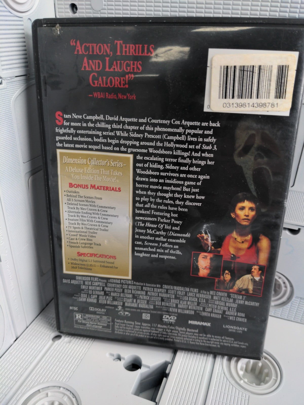 Immerse yourself in the thrilling experience of "Scream 3" on DVD. Directed by the master of horror-slashers, Wes Craven, this film promises a heart-pounding narrative that will keep you on the edge of your seat for 117 minutes. Miramax Lionsgate has ensured that this DVD provides an English language audio track, allowing for a seamless viewing experience.